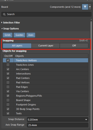 用于切換設計對象的捕捉啟用方式,All Layers(所有層)Current Layer(僅當前層)Off(關閉捕捉),也可以通過Shift+E切換;