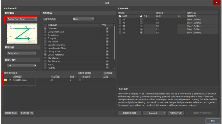 2. 打開“標注”對話框,左上角是原理圖命名控制欄,選擇命名順序,命名順序包括Z字形,N字形,反Z字形和反N字形等,左下角是選擇需要進行標注的原理圖,如果有多頁原理圖可以選擇需要進行標注的原理圖。