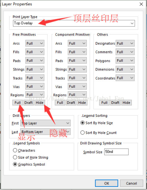 full表示顯示,hide表示隱藏 ??生成底層絲印文件時,需要勾選“mirror”