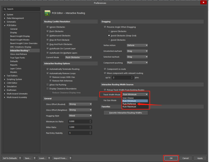 產生這個的原因是在優選項中,PCB交互布線,線寬模式選擇時,選擇了Rule Minimum.更改為Rule Preferred,點擊OK之后就可以在PCB中起作用了。