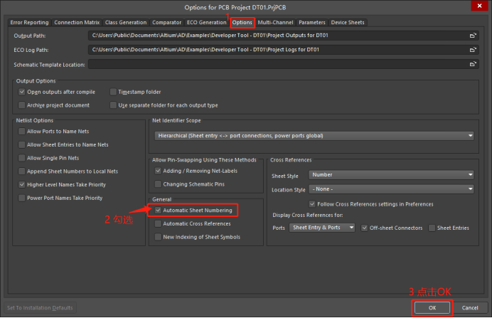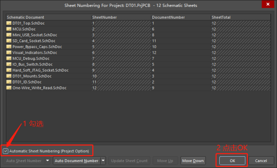 原理圖界面,“Tools-->Annotation-->Number Schematic Sheets... ”在彈出的對話框里勾選“Automatic Sheet Numbering (Project Option)”,點擊OK。