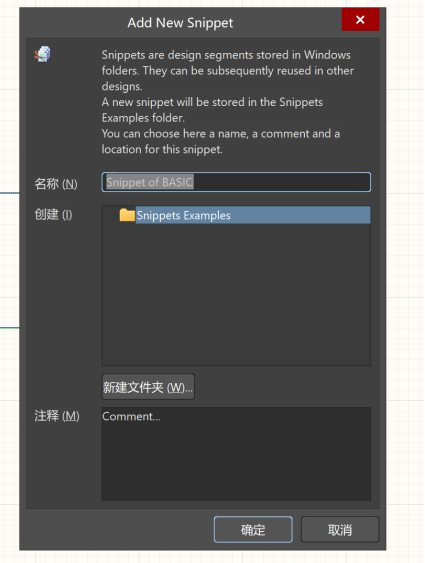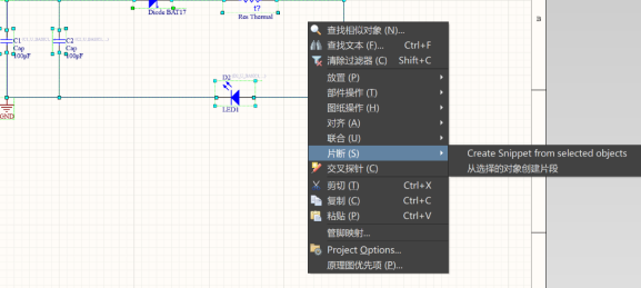 在確定好保存文件夾后,關(guān)閉該對話框,在原理圖中選中想要摘錄出來的部分電路,然后鼠標(biāo)右鍵,選擇【片段】,會出現(xiàn)兩條指令(Create Snippet from selected objects和從選擇的對象創(chuàng)建片段),實測下來,兩跳指令除了打開的對話框不同之外,實現(xiàn)的功能是相同的。