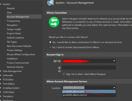 在設(shè)置-System-Account Management中的“Altium Account Management Servers是否選擇了portal365.altium.com (Altium自AD21開始此處增加了國內(nèi)服務(wù)器,但是此處連接的如果是國內(nèi)服務(wù)器,會無法進行插件安裝及軟件升級,所以這里不能選擇portal365.altium.com.cn),選擇正確服務(wù)器后在AD中重新登錄Altium Live賬號。