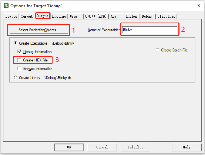 在上圖中3的位置,勾選前面復選框,來創(chuàng)建可執(zhí)行HEX文件。