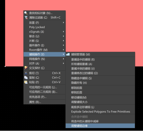 選中要修改的銅皮,右擊,在彈出的菜單中執行“鋪銅操作”—》“調整鋪銅邊緣”,光標會變成十字型,這時候就可以在銅皮邊緣直角的位置去調整鈍角。