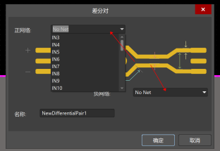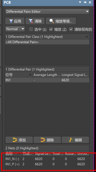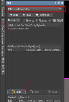 打開PCB標簽,選中差分對選項,點擊“添加”按鈕,打開差分對編輯器