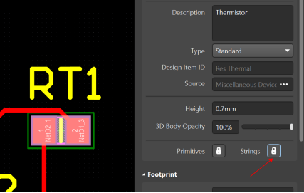 2. 如果Texts選項沒有被關閉,就去選中一個元器件,查看其屬性,Strings是否被鎖定,在鎖定狀態下,絲印無法被選中。把Strings解鎖之后,就可以選中該元器件的絲印。