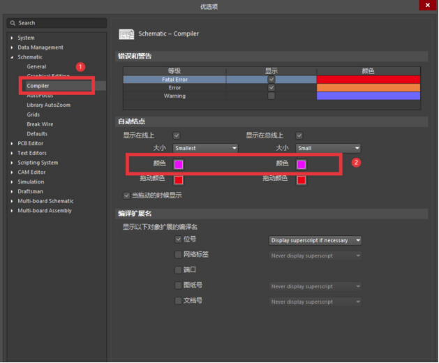 2. 進(jìn)入Schematic - Compiler 選項(xiàng)頁,更改自動(dòng)結(jié)點(diǎn)的顏色。確定后便可看到結(jié)點(diǎn)顏色被更改。