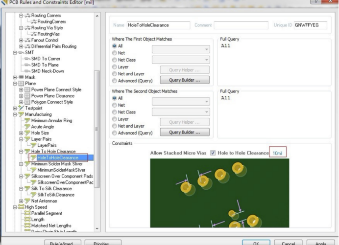 manufacturing>hole to hole clearance,把這個值設(shè)置的小一點(diǎn),如圖10mil
