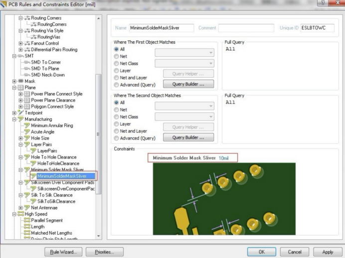 Minimum Solder Mask Sliver設(shè)置的小一點(diǎn),如圖10mil