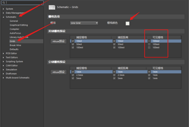 第二步, 點擊“Schematic”->"Grids".如果只想去掉柵格,可以直接將紅框框中的三個選項框取消勾選。如果還想設(shè)置為別的顏色背景,就選擇柵格顏色就行。