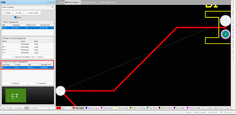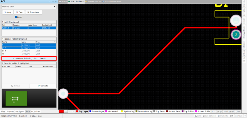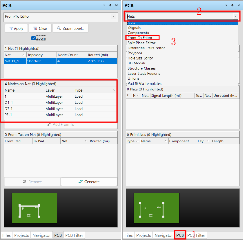 進入到PCB面板中,下拉框進入“From-To-Editor”模式,可以看到有四處節點。