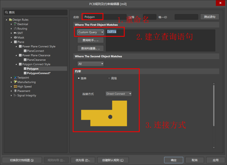 新建規(guī)則后進(jìn)入先重命名規(guī)則,建立查詢語句“IsVia”,選則連接方式。