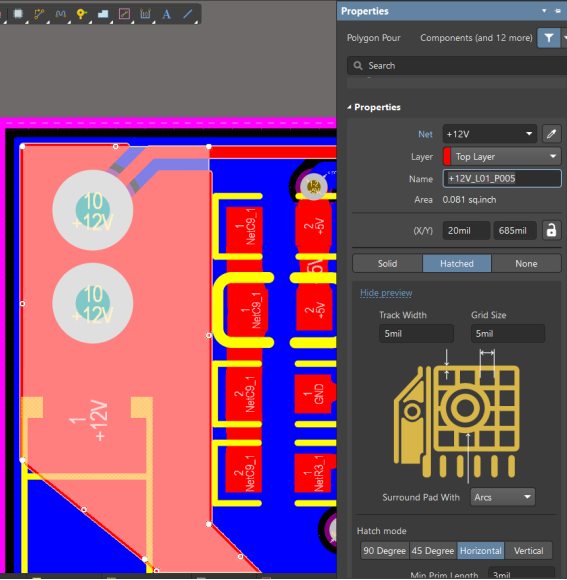 二、 焊盤和鋪銅之間默認(rèn)設(shè)置為十字連接,借下來操作變?yōu)橹苯舆B接。