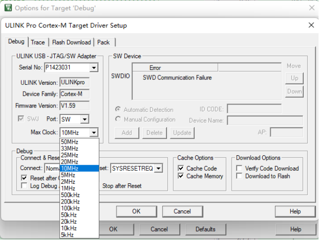 然后通過選擇Max Clock調整下載速度,注意這里最高的速度為50MHZ,但是可使用的最高下載速度是根據下載器所支持的最高下載速度來設定,超過下載器所支持的最高下載速度是無法使用的。