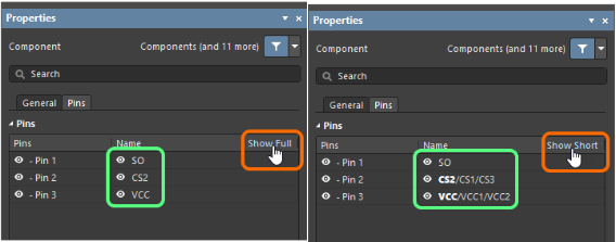 與前版本不同之處在這,在“Pin”選項(xiàng)卡上的屬性面板的“組件〞模式中,使用網(wǎng)格頂部的“Show Full/Show Short”來顯示或隱藏列出的所有引腳的備選引腳名稱。