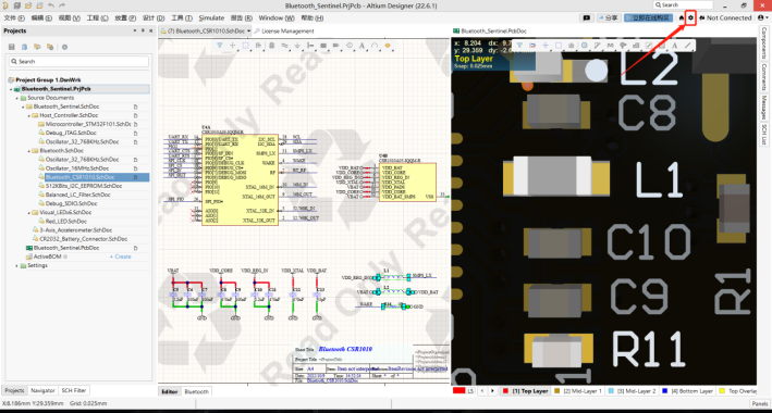 在原理圖上選中一個(gè)元器件后,PCB中也會(huì)出現(xiàn)元器件高亮狀態(tài)。