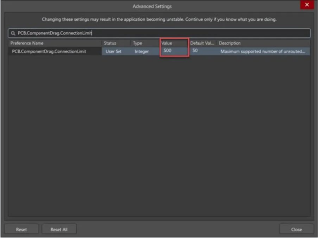 Preferences—System—General--Advanced button—然后進行搜索 PCB.ComponentDrag.ConnectionLimit--將值增加到500。