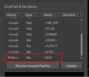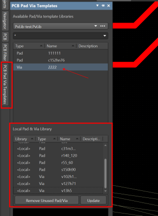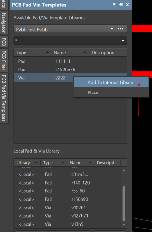 把Pvlib添加到項(xiàng)目中后還需要做一步操作。在PCB界面點(diǎn)擊右下角Panels,打開(kāi)PCB Pad Via Templates,Via 2222為自己創(chuàng)建的過(guò)孔,下方Local Pad & Via Library為當(dāng)前可使用的一些焊盤(pán)和過(guò)孔模板,在這里面沒(méi)有Via 2222,需要把2222添加進(jìn)去。