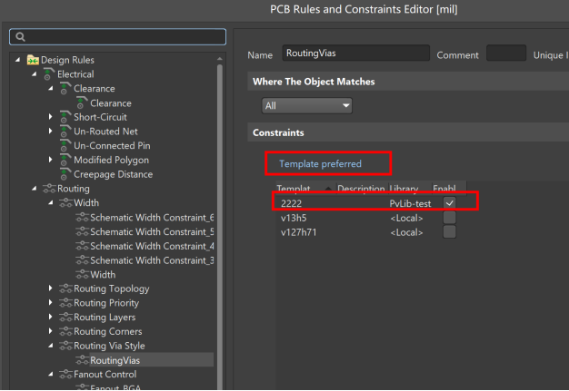 添加完之后,打開(kāi)規(guī)則約束編輯器,找到RoutingVias,選擇Template preferred,就能看到被添加進(jìn)去的Via 2222,打勾后就能正常使用這個(gè)過(guò)孔了。
