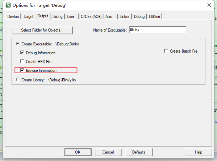 通過點擊options for target,選擇output欄,將Browse Information進行勾選后,重新編譯一下,即可將跳轉功能回復正常。
