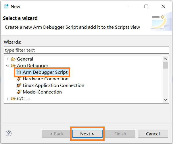b. 在 新建對(duì)話框中, 選擇 Arm Debugger →?Arm Debugger Script,單擊 Next.