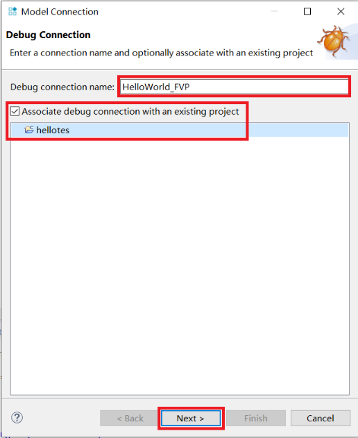 3. 在 Model Connection對(duì)話框中, 輸入調(diào)試鏈接名字,例如HelloWorld_FVP,關(guān)聯(lián)項(xiàng)目,然后單擊Next按鈕