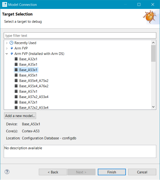 4.在Target Selection 對(duì)話框中, 選擇Arm FVP (Installed with Arm DS) →?Base_A53x1,單擊Finish按鈕。