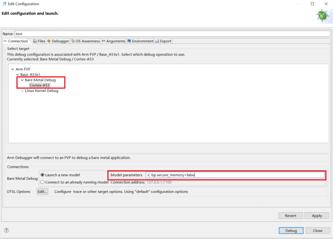 a. 在 Connection 選項(xiàng)卡里, 確保 Arm FVP (Installed with Arm DS) →?Base_A53x1 →?Bare Metal Debug →?Cortex-A53 被選中.