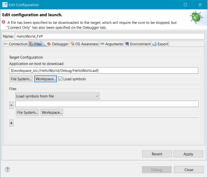 c. 在Files 選項(xiàng)卡中, 選擇 Target Configuration →?Application on host to download →?Workspace.