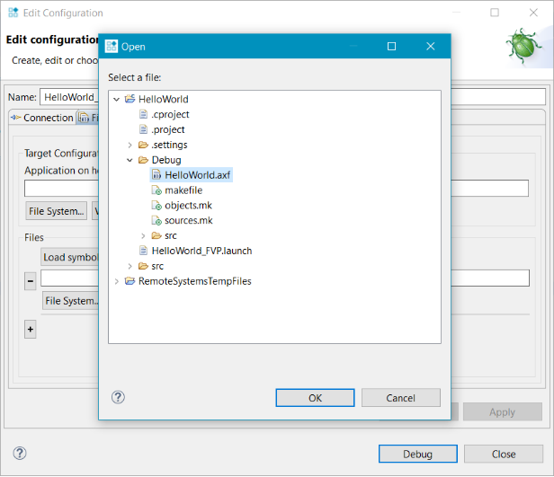 d. 單擊展開 HelloWorld 項(xiàng)目下Debug 文件夾, 選擇 HelloWorld.axf 并單擊OK.