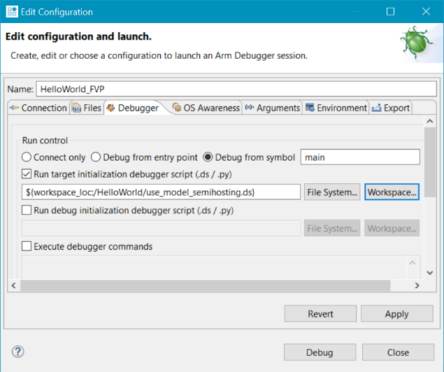 f. 使能 Run target initialization debugger script (.ds/.py) ,單擊Workspace....