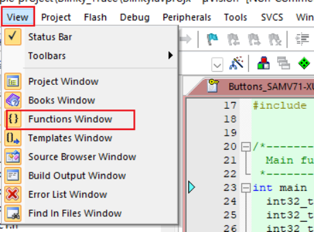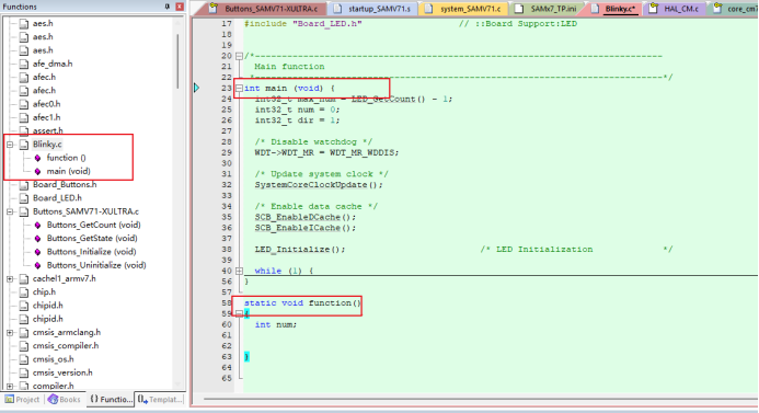 Function窗口通過view->functions window打開(如圖一),F(xiàn)unction窗口可以顯示工程中所有文件的函數(shù)名,相比在頭文件中查看函數(shù)名外,function窗口也可以顯示出文件中編寫的靜態(tài)函數(shù)(如圖二)。