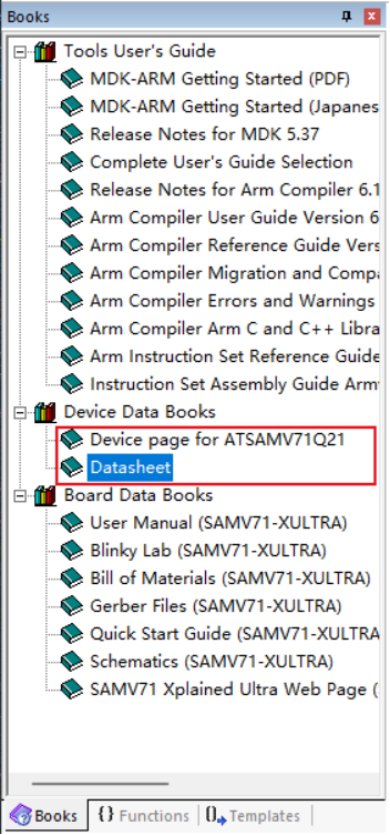 Keil中有一個Book window的窗口視圖,可以通過view->Books Window打開。在Books窗口中可以看到Device Data Books欄中就有對應設備的Datasheet。