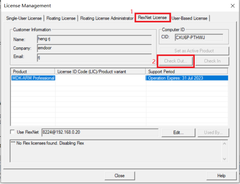 2.單擊FlexNet License選項(xiàng)卡,然后單擊Check Out按鈕,即可借出。