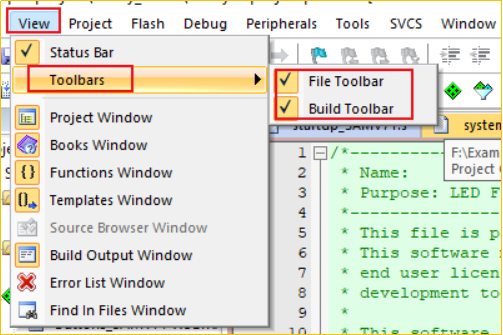 若Keil界面工具欄未顯示出來,可以通過veiw->Toolsbars->File Toolbar/Build Toolbar打開。