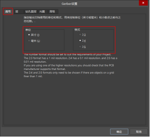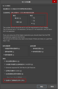 在彈出的“NC Drill設(shè)置”的對(duì)話框中,單位選擇“英寸”,格式選擇“2:5”,勾選中最底下的“生成EIA二進(jìn)制鉆孔文件”。點(diǎn)擊確定。