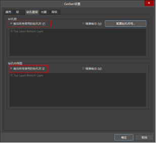 鉆孔圖層選項(xiàng)卡中,在鉆孔圖和鉆孔向?qū)D中勾選“輸出所有使用的鉆孔對(duì)”。