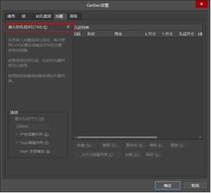 光圈選項(xiàng)卡中,勾選“嵌入的孔徑(RS274X)”。