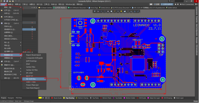 回到PCB文件界面中,菜單欄“文件”→“制造輸出”→NC Drill Files命令。