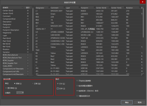 在彈出的拾放文件設(shè)置的對(duì)話框中,進(jìn)行相應(yīng)設(shè)置,輸出設(shè)置單位“英制”,格式“CSV”。
