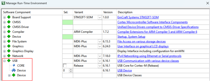 Keil MDK的Pro版中的“Manage Run-Time Environment”管理器中,沒(méi)有Usb Host中間件組件的選項(xiàng),如圖2-1所示: