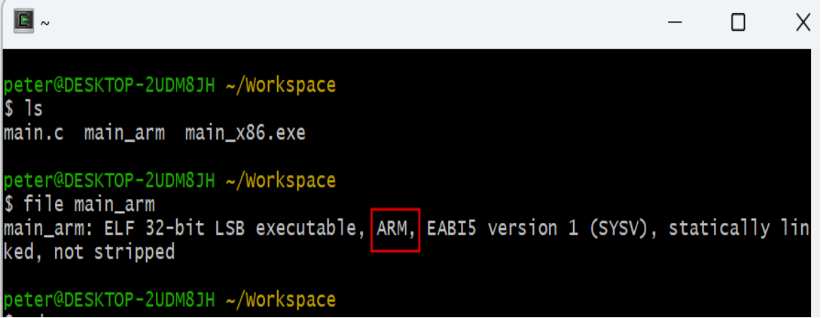 6)在工作目錄下,創(chuàng)建一個“.c”的Helloworld的源程序,通過“arm-none-eabi-gcc -o main_arm main.c -lc --specs=nosys.specs”編譯出可以執(zhí)行文件,如圖4-6所示: