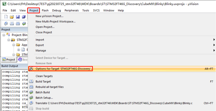 1 在菜單點(diǎn)擊“Project”-->“Options for Target ‘ Project name ’…”。